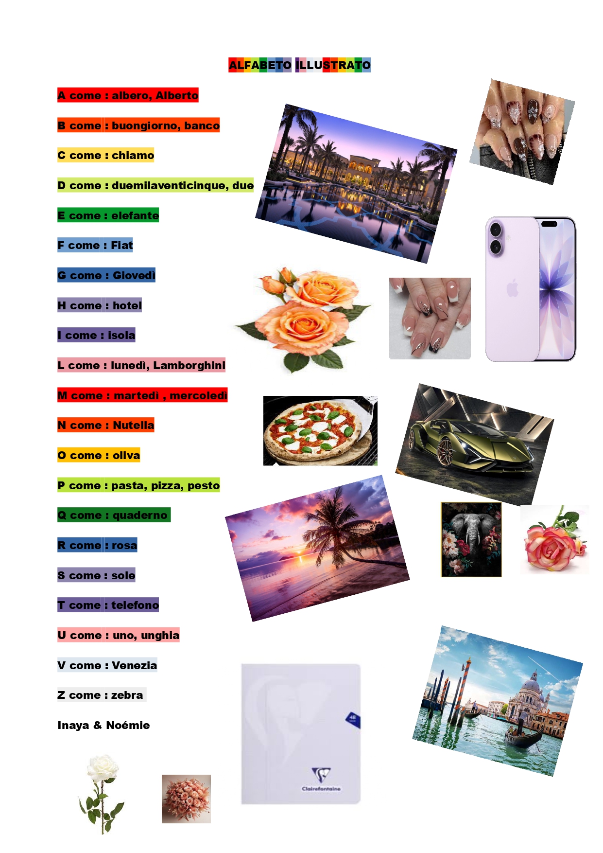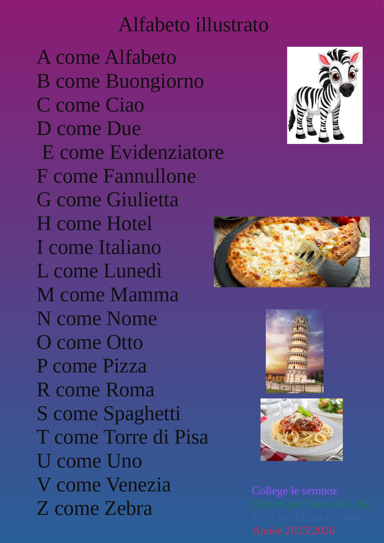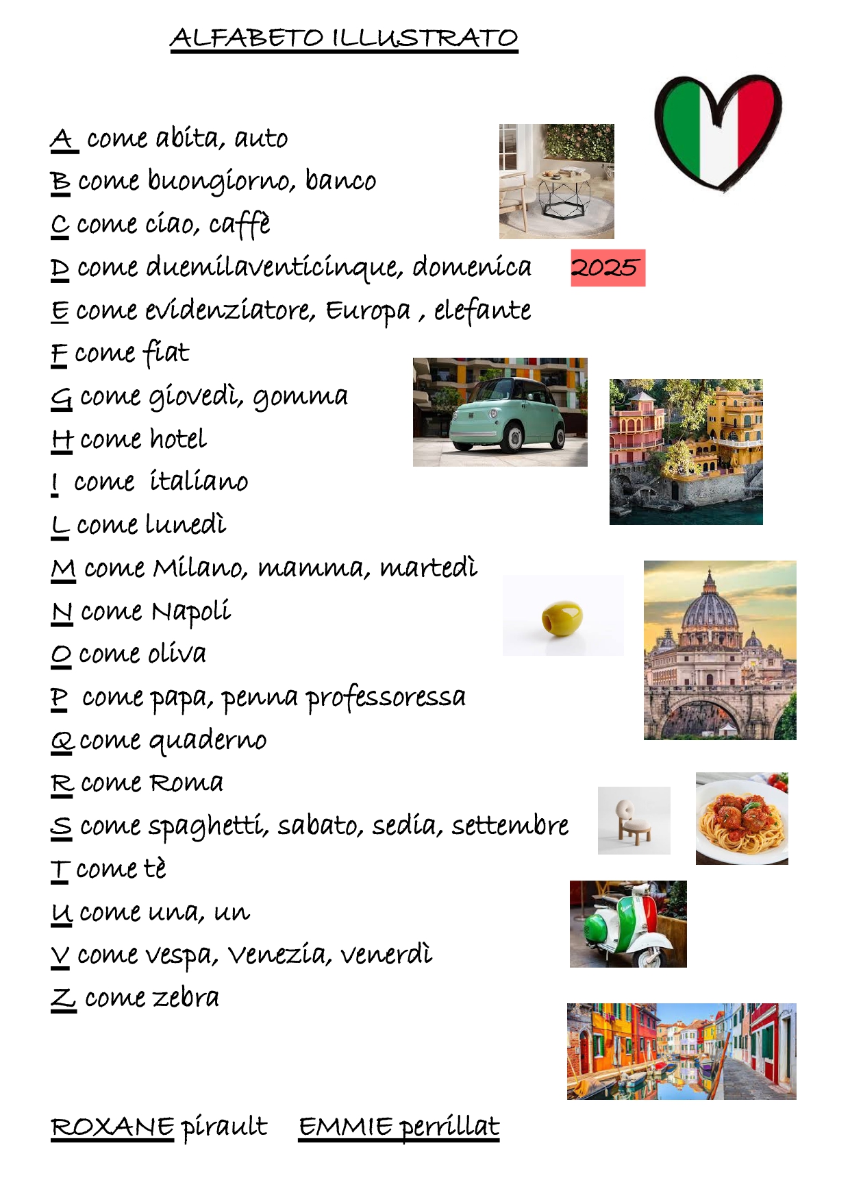 Après avoir appris qu'en italien l'alphabet se compose de 21 lettres (en effet, les lettres j, k, w, x et y ne font pas partie de l'alphabet italien contrairement au français) et après avoir appris leurs premiers mots et travaillé sur leurs représentations de l'Italie, les élèves de 6°1/2 bilangue ont réalisé un alphabet illustré.