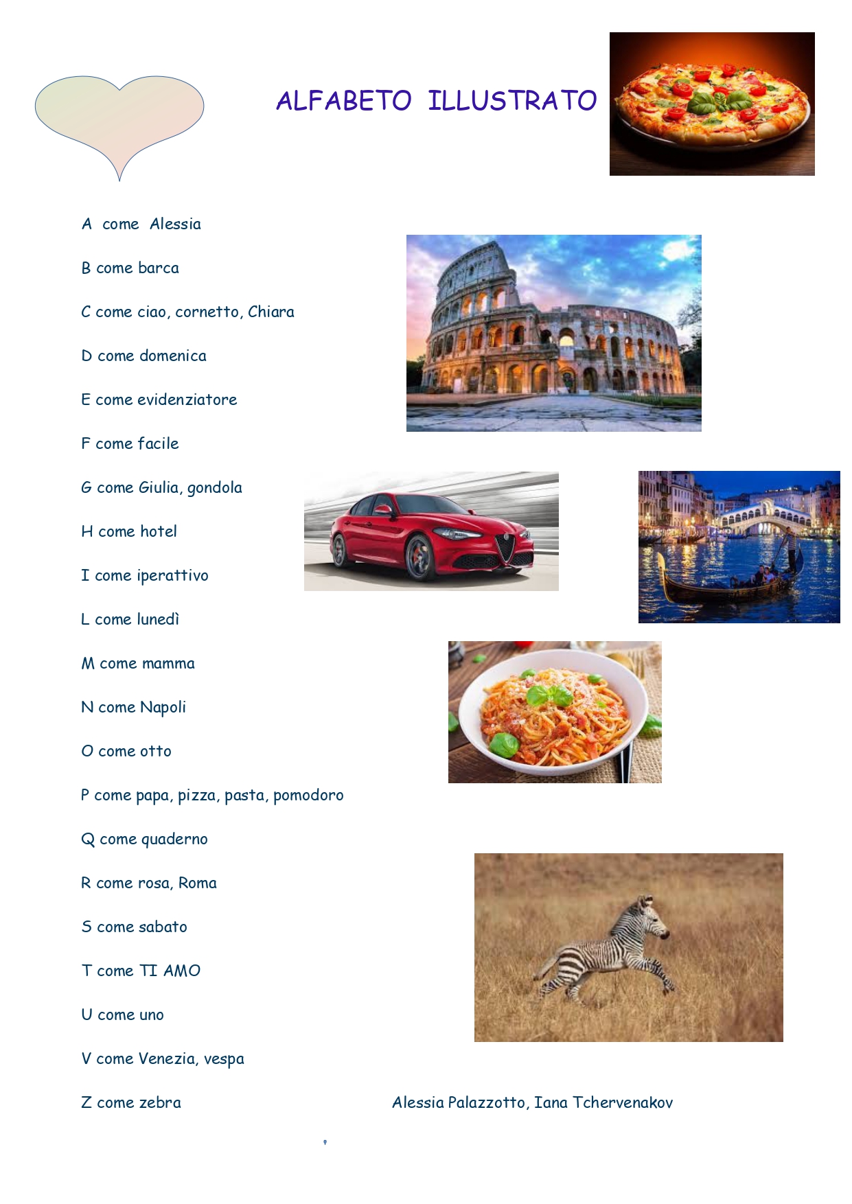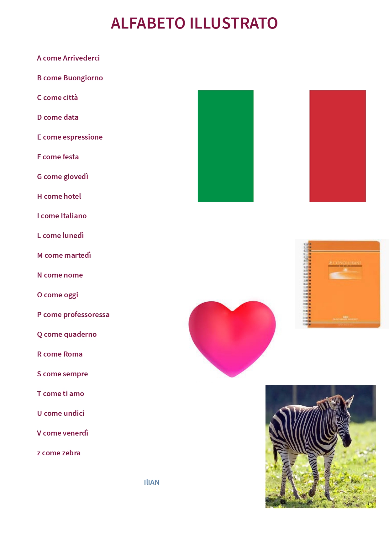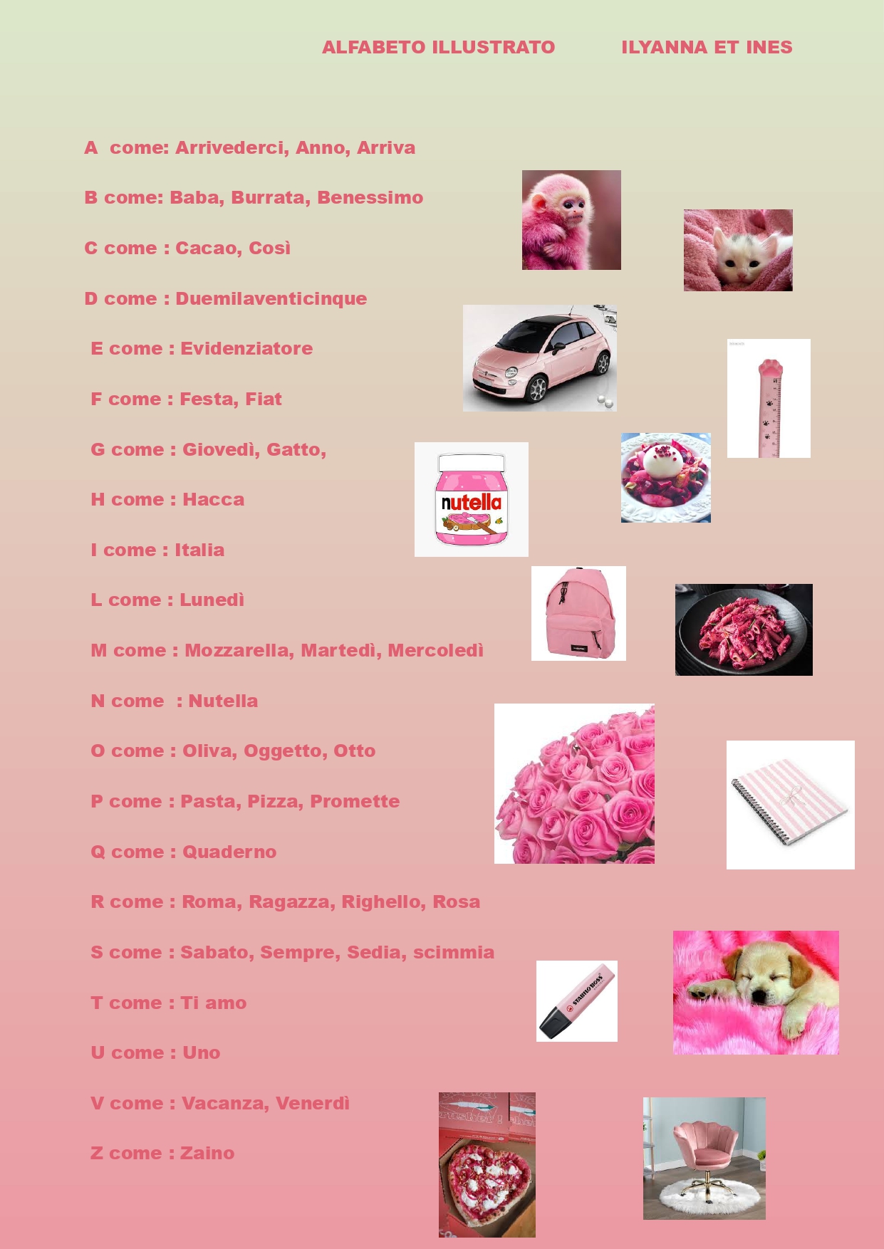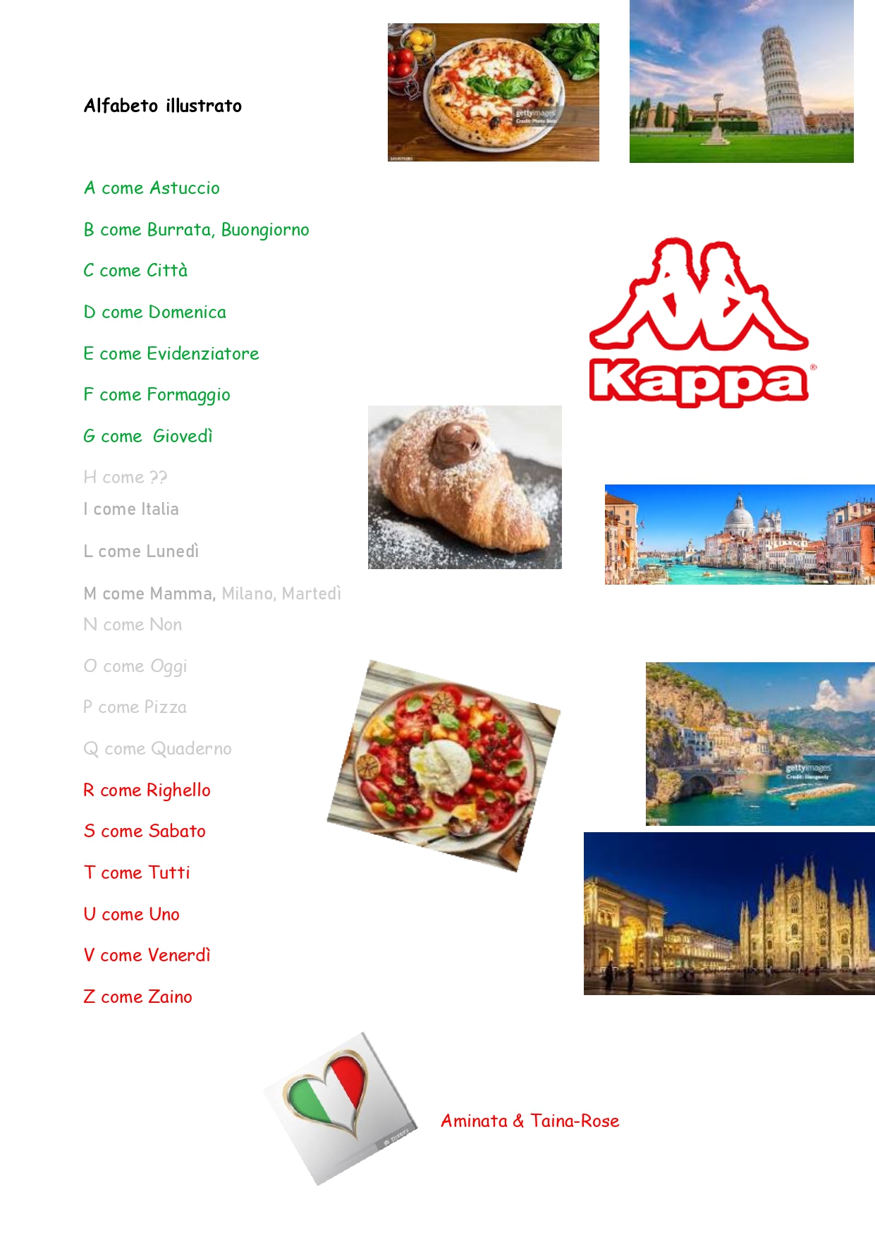 Après avoir appris qu'en italien l'alphabet se compose de 21 lettres (en effet, les lettres j, k, w, x et y ne font pas partie de l'alphabet italien contrairement au français) et après avoir appris leurs premiers mots et travaillé sur leurs représentations de l'Italie, les élèves de 6°1/2 bilangue ont réalisé un alphabet illustré.