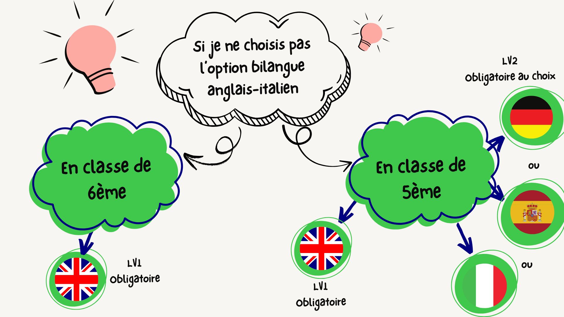 L’option bilangue permet l’apprentissage de 2 langues vivantes en parallèle dès l’entrée en 6ème à raison de 3 heures en anglais et 3 heures en italien.