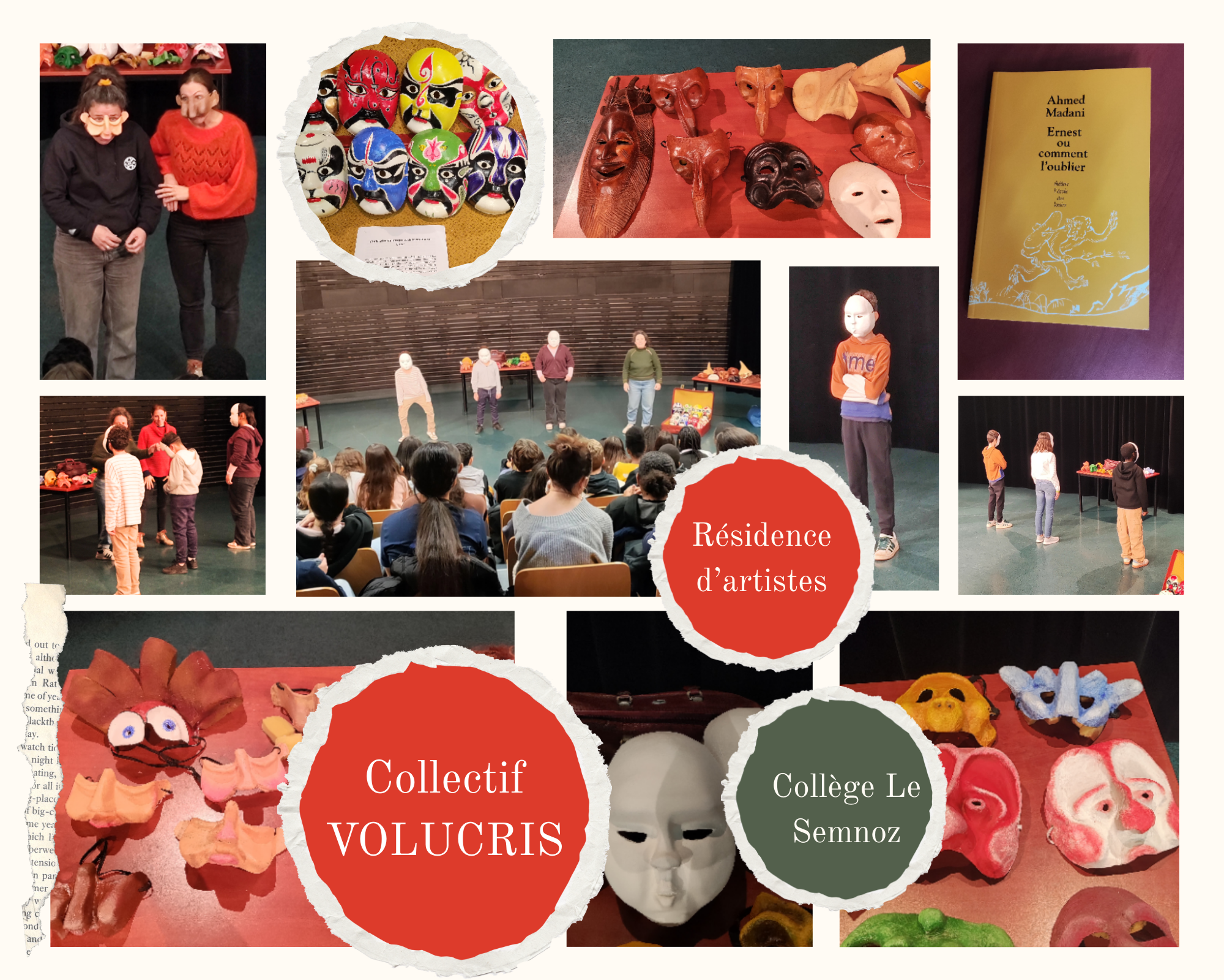 La Compagnie de théâtre masqué Volucris sera au collège Le Semnoz pendant cinq semaines au fil de l'année scolaire 2025-2026. Les comédiennes, Hélène et Margot, travailleront à la création de leur nouveau spectacle, Ernest ou Comment l'oublier, d'Ahmed MADANI, qui traite avec humour et poésie, de la question de la vieillesse et de la mémoire.